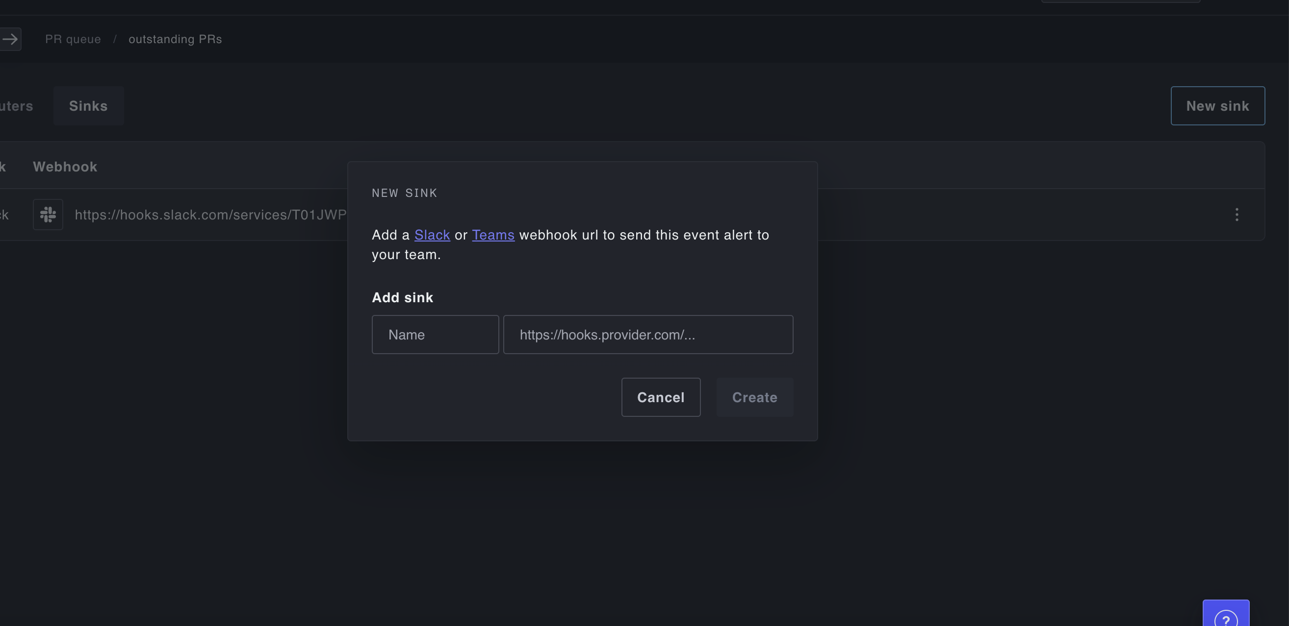 The simplest way to configure a notification sink is via the UI. You can simply go to /notifications/sinks in your instance of the Plural Console, then click the Create Sink button in the top right, you should see a wizard like the one below: